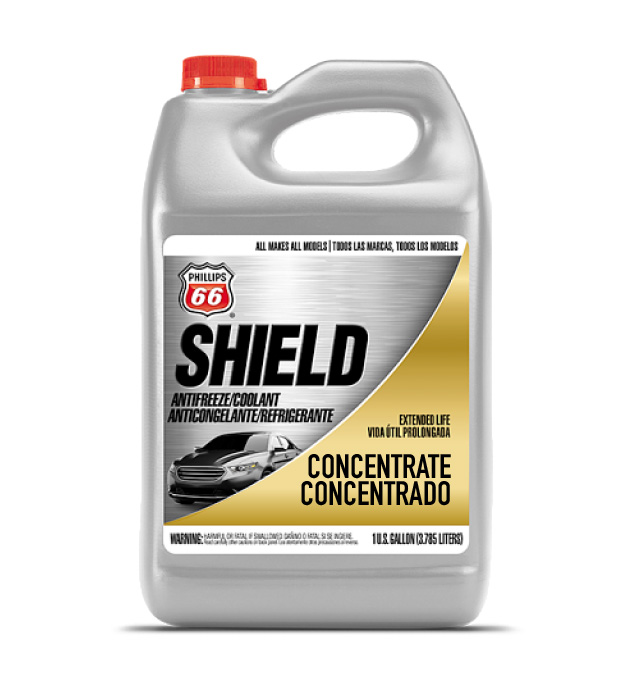 El anticongelante/refrigerante Phillips 66 ® Shield está formulado para brindar protección de larga duración hasta 5 años o 150,000 millas (cuando se enjuaga y se llena según las instrucciones) y es compatible con cualquier anticongelante/refrigerante utilizado en cualquier vehículo. Hay fórmulas concentradas y prediluidas 50/50 disponibles.